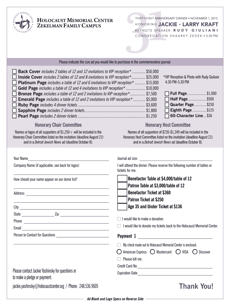 31 thirty-first Anniversary Dinner November 1, 2015, Honoring Jackie + Larry Kraft K e y n o t e S p e AK e r : R u d y G i u l i an n i C o n g r e g a t i o n Shaw r e y Z e d e k 5:30 PM Please