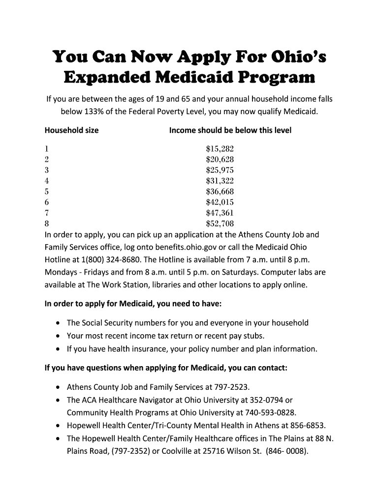 This document provides information about Ohio's expanded Medicaid program, eligibility requirements, and application procedures.
