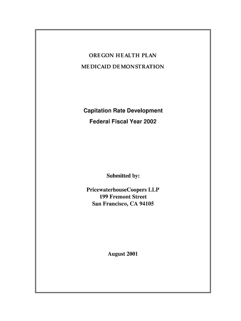 This document outlines the calculation of capitation rates for various health plans under the Oregon Health Plan Medicaid Demonstration. It details the methods and adjustments made to establish payment