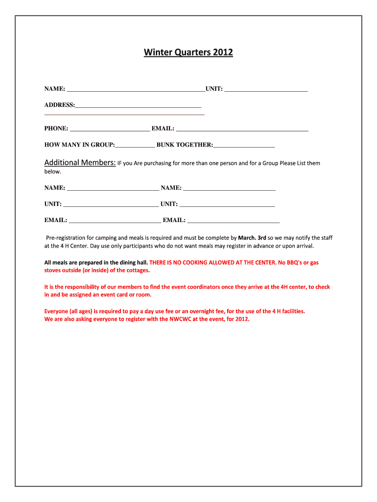 Winter Quarters 2012 NAME: UNIT: ADDRESS: PHONE: EMAIL: HOW MANY IN GROUP: BUNK TOGETHER: Additional Members: IF you Are purchasing for more than one person and for a Group Please List them below.