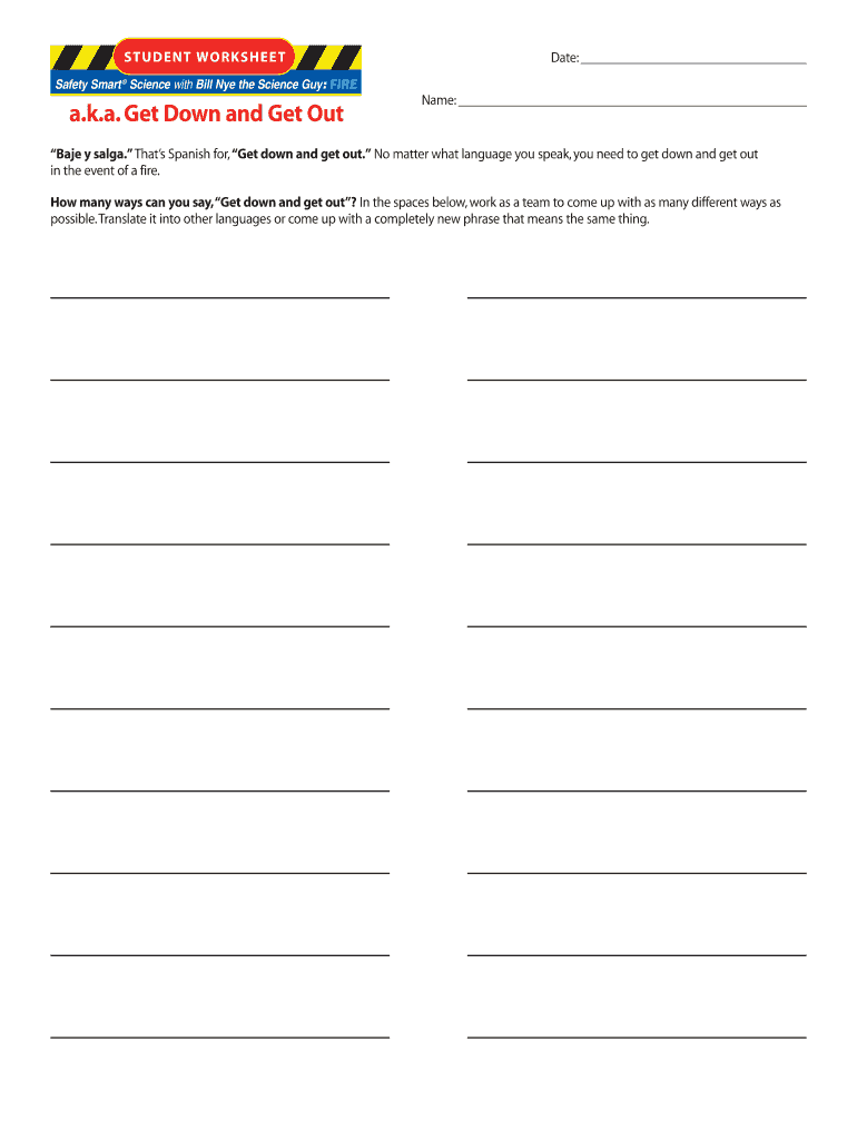 STUDENT WORKSHEET Date: Safety Smart Science with Bill Nye the Science Guy: FIRE a.k.a. Get Down and Get Out Name: Base y saga. That's Spanish for, Get down and get out. No matter what language you