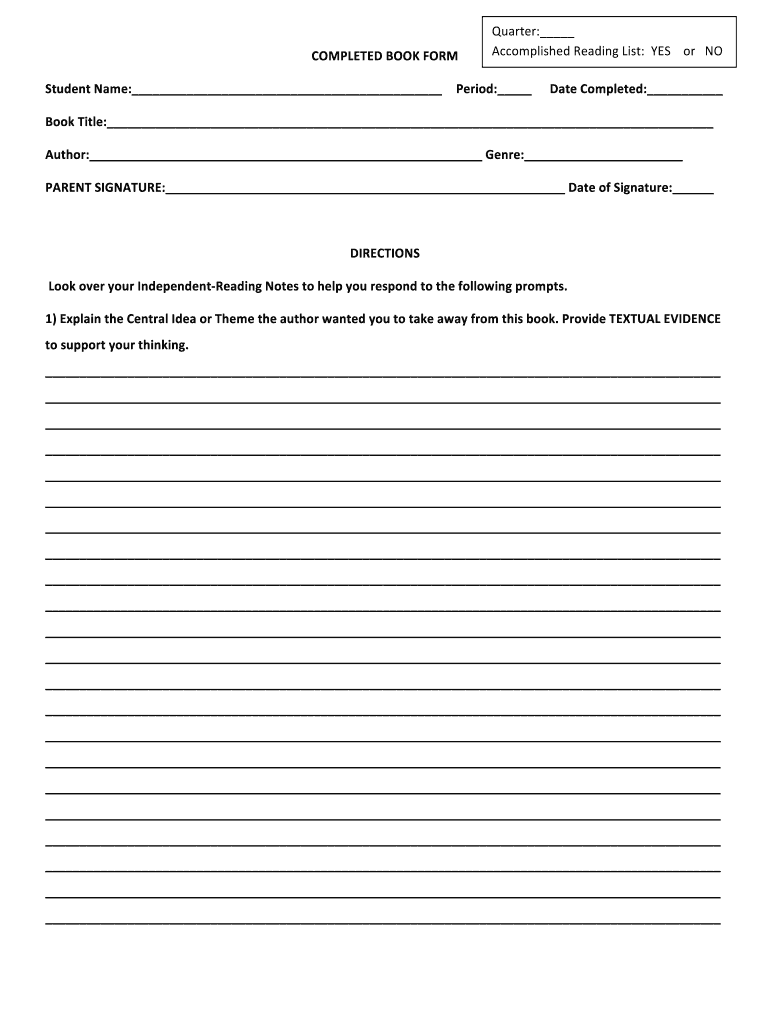 The Reading Completion Form is designed to document a student's independent reading assignments. This essential tool captures key information, including the title, author, and genre of the book read by the student. By using this form, students can formally record and reflect on their reading experiences, ensuring a structured approach to their learning.