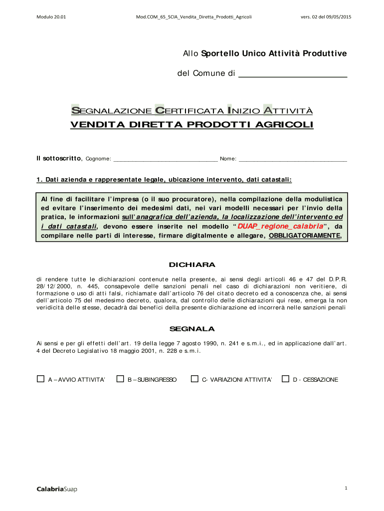 Modulo 20.01 Mod.COM 65 CIA Vending Biretta Product Agricola very. 02 Del 09×05/2015 All Portillo UNIDO Activity Productive Del Commune di SEGNALAZIONE CERTIFICATE INITIO ACTIVITY VEND ITA BIRETTA