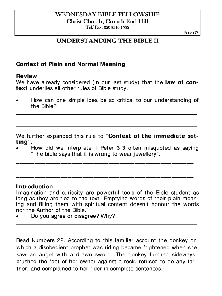 WEDNESDAY BIBLE FELLOWSHIP Christ Church, Crouch End Hill Tel/ Fax: 020 8340 1566 No: 62 UNDERSTANDING THE BIBLE II Context of Plain and Normal Meaning Review We have already considered (in our last