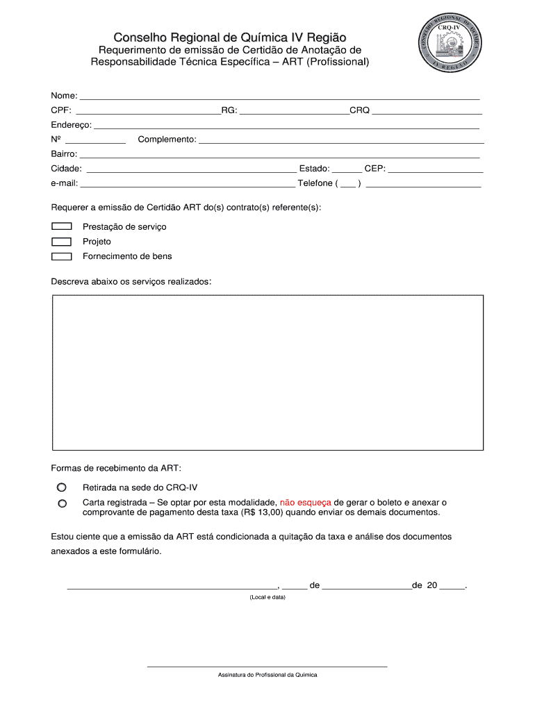 Consuelo Regional de Qumica IV Region Requirements DE emission DE Certify de Antão de Responsabilidade Tunica Specific ART (Professional) Nome: CPF: KG: CRQ Endear: N Complement: Herero: MIDADE: