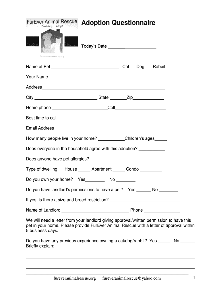 Adoption Questionnaire Today's Date Name of Pet Cat Dog Rabbit Your Name Address City State Zip Home phone Cell Best time to call Email Address How many people live in your home? Children sages Do
