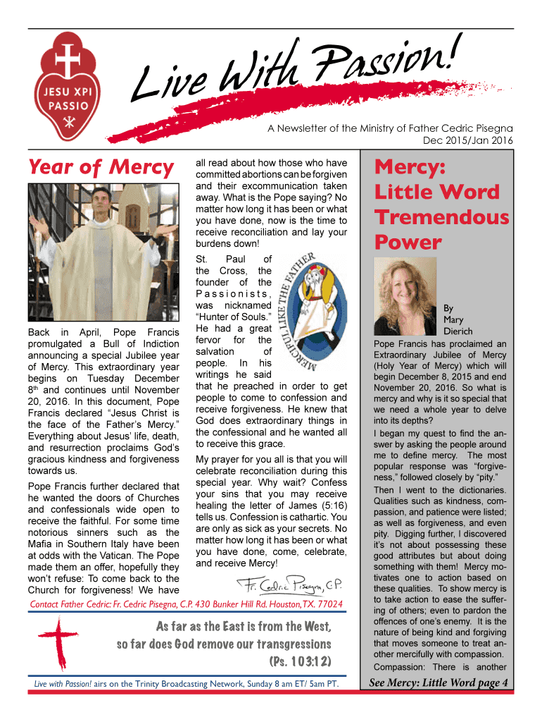 Passion! With P Live A Newsletter of the Ministry of Father Cedric Vienna Dec 2015×Jan 2016 Year of Mercy Back in April, Pope Francis promulgated a Bull of Indication announcing a special Jubilee