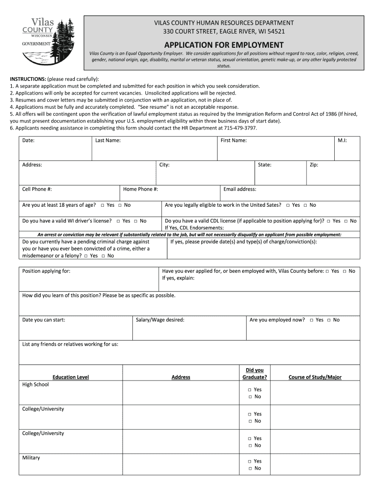 Get the free Vilas County Employment Application