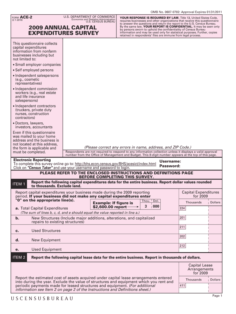 OMB No. 06070782: Approval Expires 01×31/2011 ACE2 FORM (212010× U.S. DEPARTMENT OF COMMERCE Economics and Statistics Administration U.S. CENSUS BUREAU 2009 ANNUAL CAPITAL EXPENDITURES SURVEY This