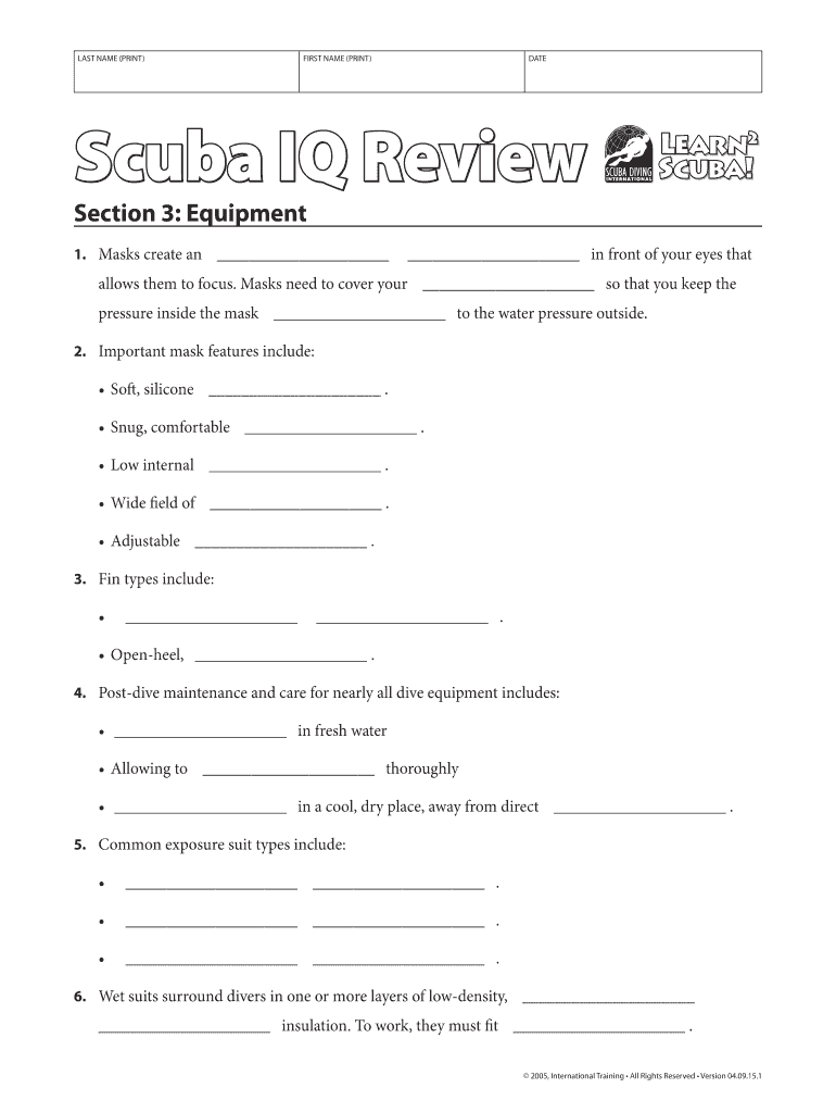 LAST NAME (PRINT) FIRST NAME (PRINT) DATE Scuba IQ Review Section 3: Equipment 1. Masks create an in front of your eyes that allows them to focus. Masks need to cover your so that you keep the pressure