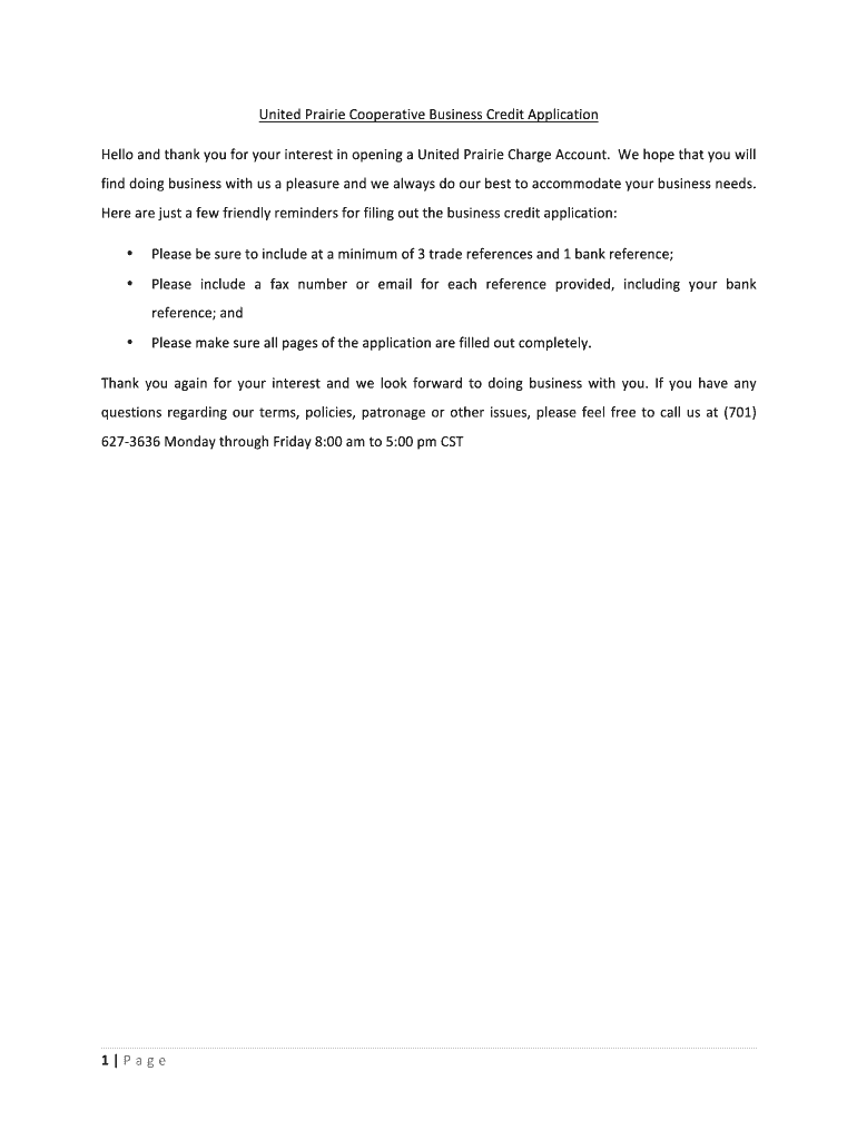 United Prairie Cooperative Business Credit Application Hello and thank you for your interest in opening a United Prairie Charge Account. We hope that you will find doing business with us a pleasure,