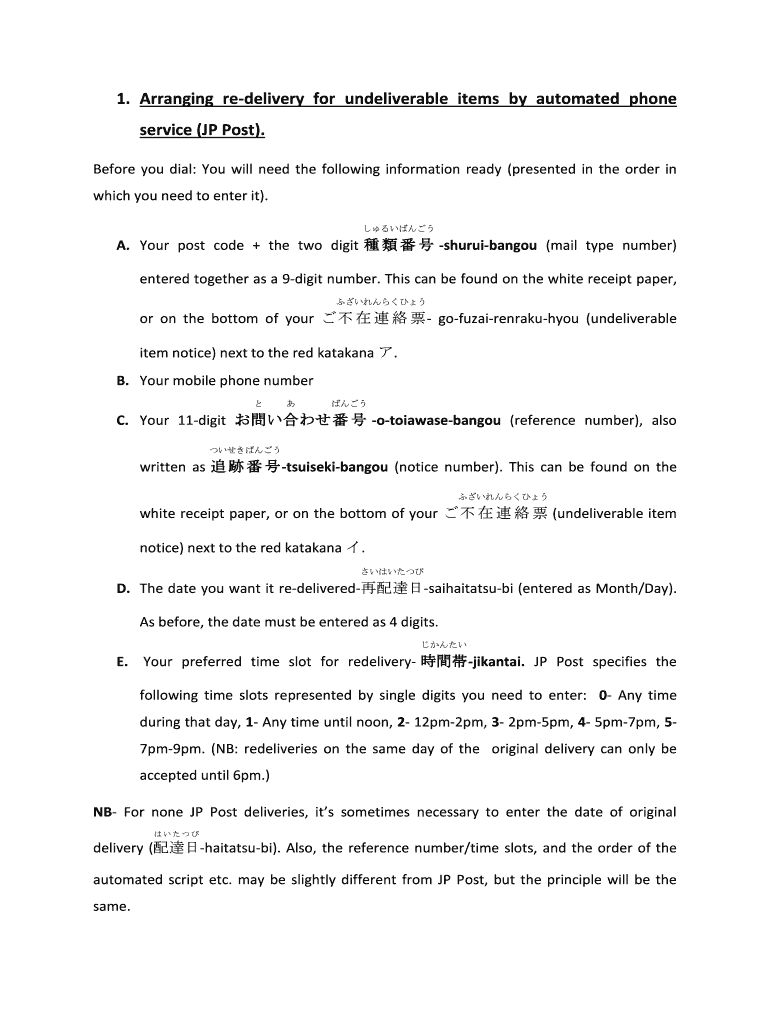 1. Arranging redelivery for undeliverable items by automated phone service (JP Post×. Before you dial: You will need the following information ready (presented in the order in which you need to enter