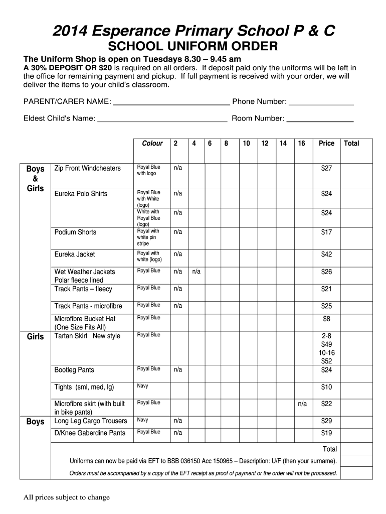 Esperance Primary School Uniform Order 2014-2026 free printable template