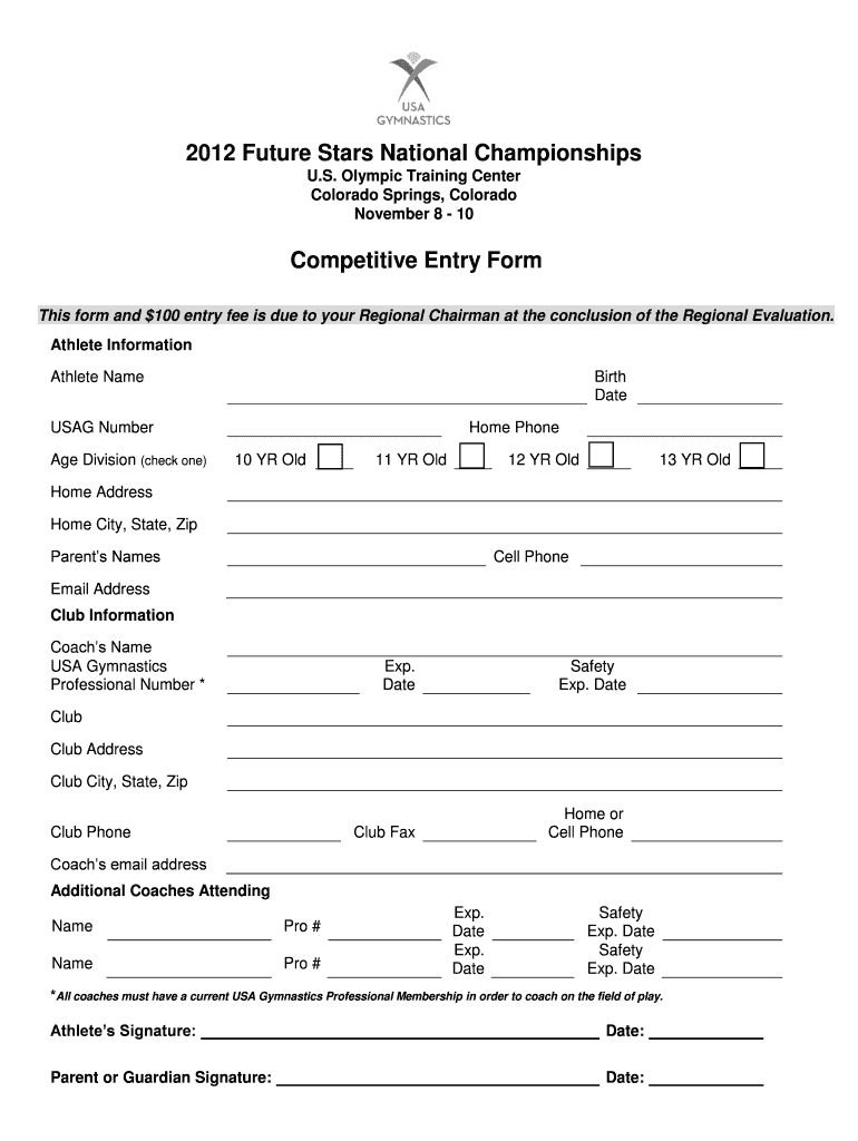 2012 Future Stars National Championships U.S. Olympic Training Center Colorado Springs, Colorado November 8 10 Competitive Entry Form This form and $100 entry fee is due to your Regional Chairman