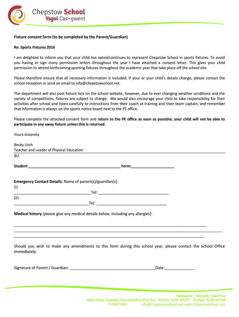 Get the free Fixture consent form to be completed by the Parent - chepstowschool