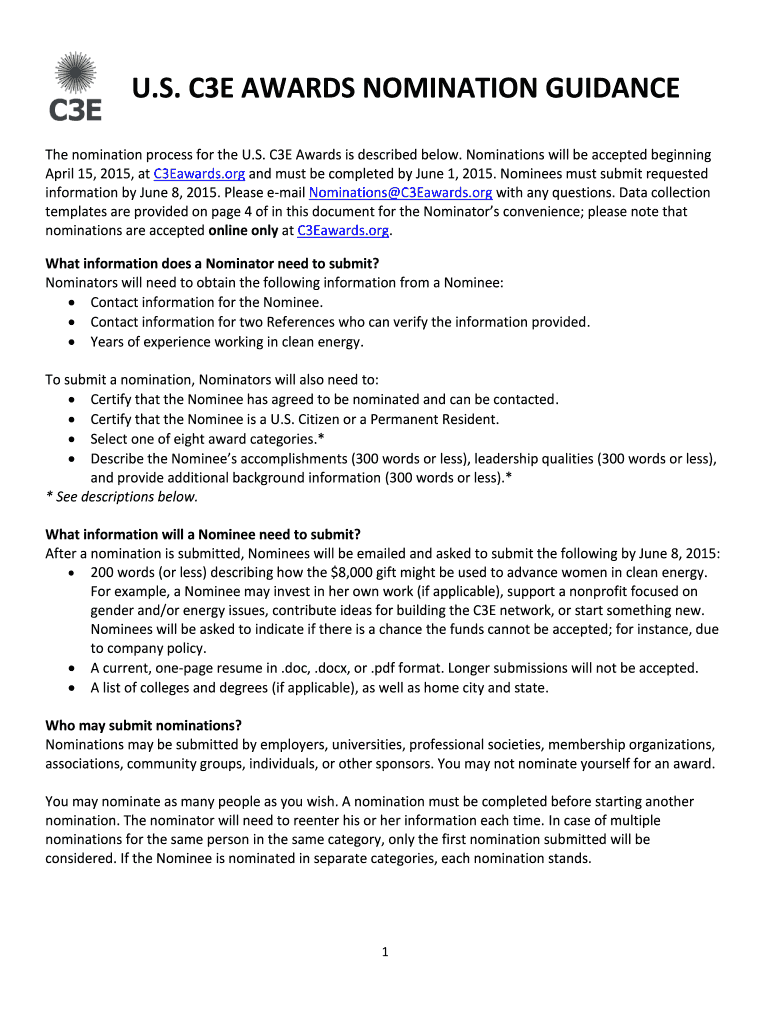 The nomination process for the U.S. C3E Awards is described below. Nominations will be accepted beginning