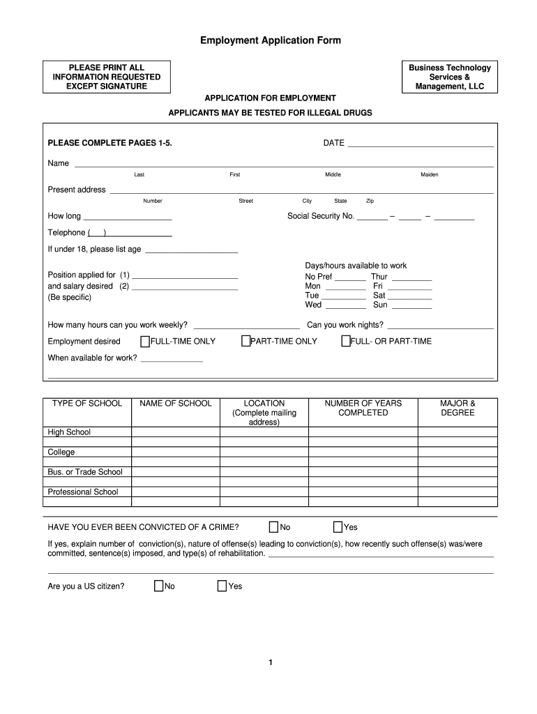 The Employment Application Form is a document used by Business Technology Services & Management, LLC to collect essential information from job applicants for potential employment.