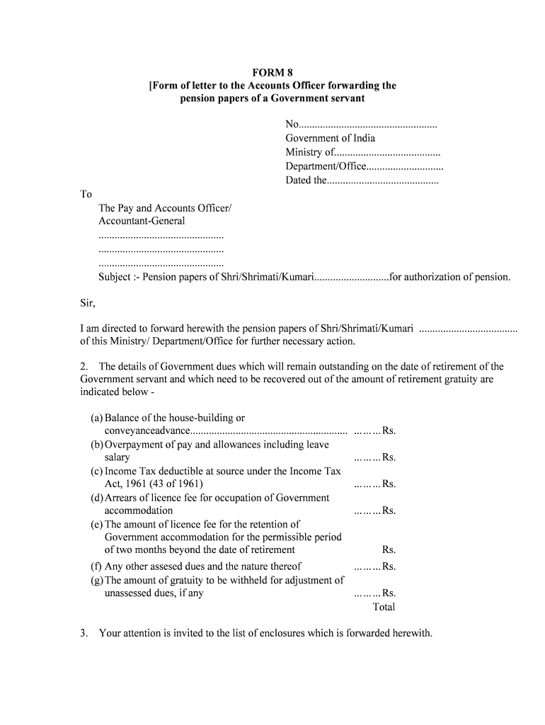 FORM 8 Form of letter to the Accounts Officer forwarding the pension papers of a Government servant No.................................................... Government of India Ministry of........................................
