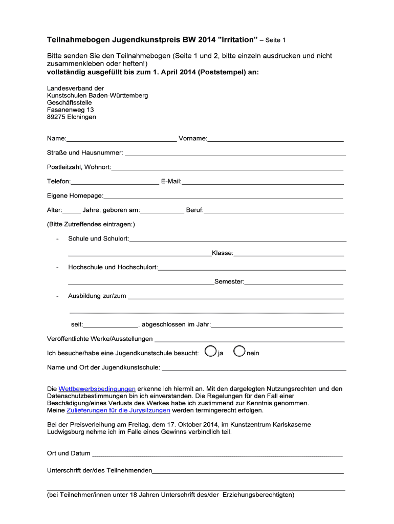 So füllen Sie teilnahmebogen jugendkunstpreis bw 2014 aus