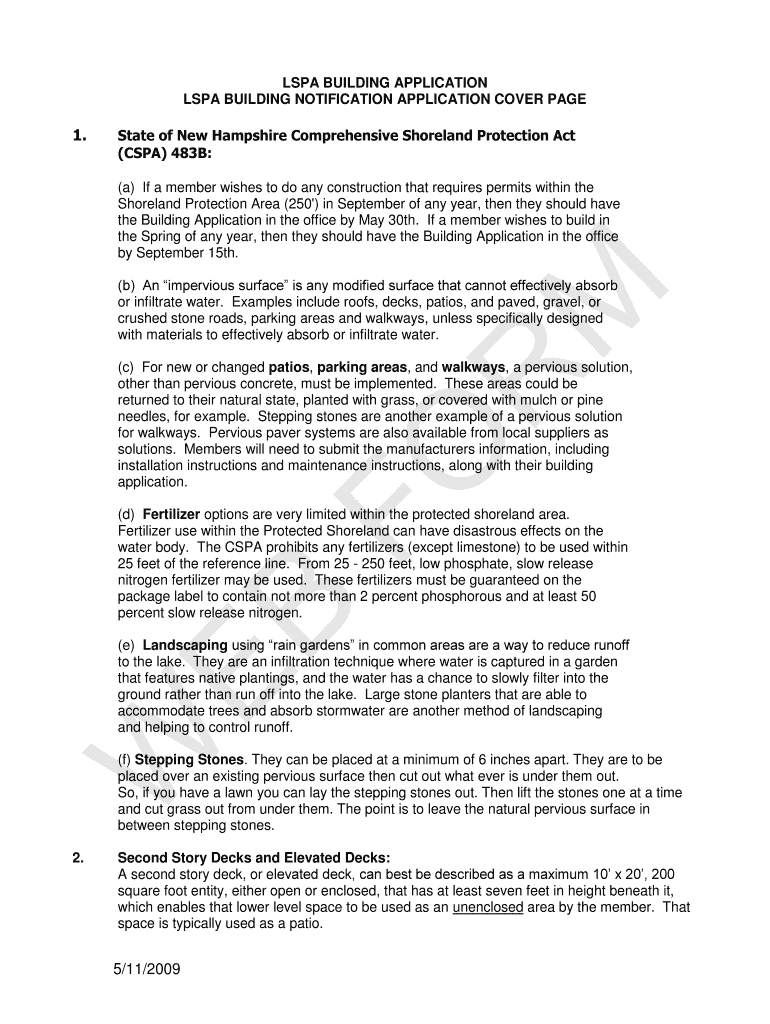 SPA BUILDING APPLICATION SPA BUILDING NOTIFICATION APPLICATION COVER PAGE 1. State of New Hampshire Comprehensive Shore land Protection Act (SPA) 483B: (a) If a member wishes to do any construction