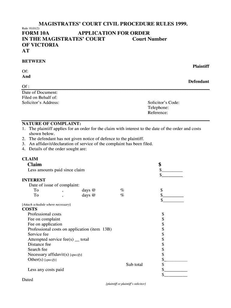 The Victoria Magistrates Court Application Form 10A is a legal document used by plaintiffs and solicitors to request an order regarding a claim in the Magistrates' Court of Victoria.