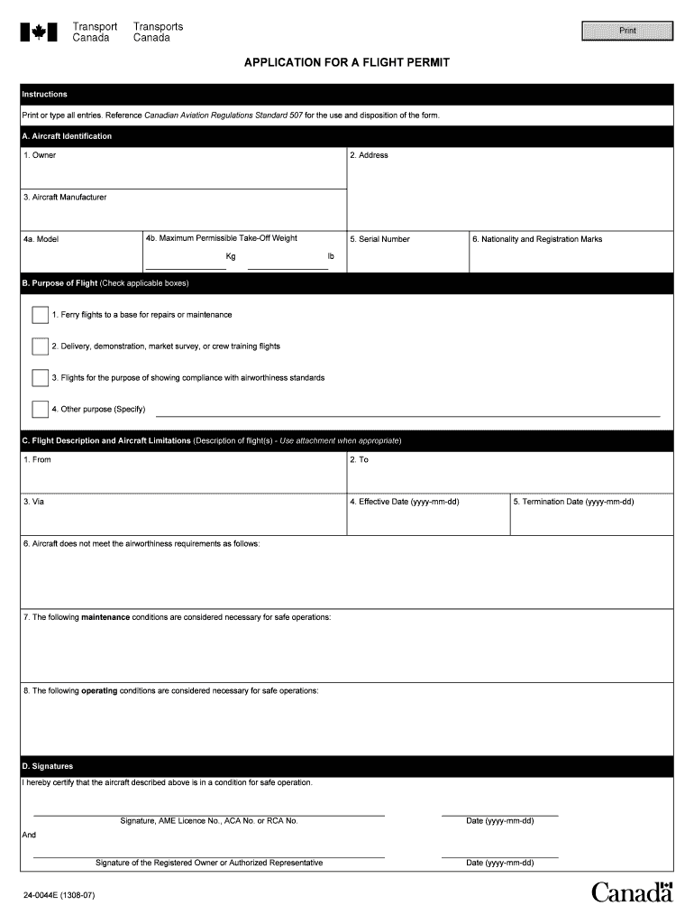 The Flight Permit Application is a government form used by individuals in Canada to request a flight permit for various aviation-related activities.