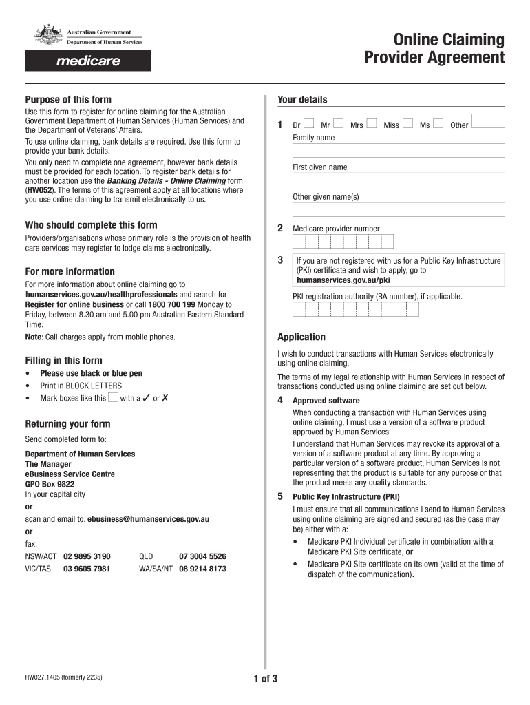 Online Claiming Provider Agreement Purpose of this form Your details Use this form to register for online claiming for the Australian Government Department of Human Services (Human Services) and the