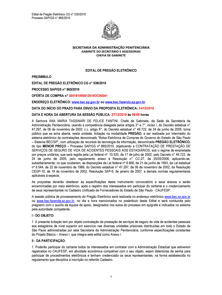Edital de Prego Electric CG n 030×2010 Process SAP×GS n 865×2010 SECRETARIAT DA ADMINISTRATOR PENITENCIRIA CABINET DO SECRET RIO E ASSESSOR IAS CHEF IA DE CABINET EDIT AL DE PRESO ELECTRIC PREMIUM