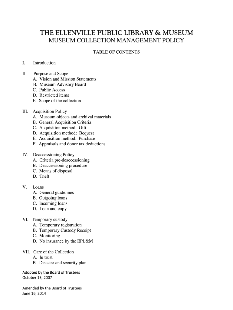 THE BELLEVILLE PUBLIC LIBRARY & MUSEUM COLLECTION MANAGEMENT POLICY TABLE OF CONTENTS I. Introduction II. Purpose and Scope A. Vision and Mission Statements B. Museum Advisory Board C. Public Access