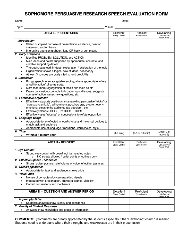 Get the free SOPHOMORE PERSUASIVE RESEARCH SPEECH EVALUATION FORM - G Web