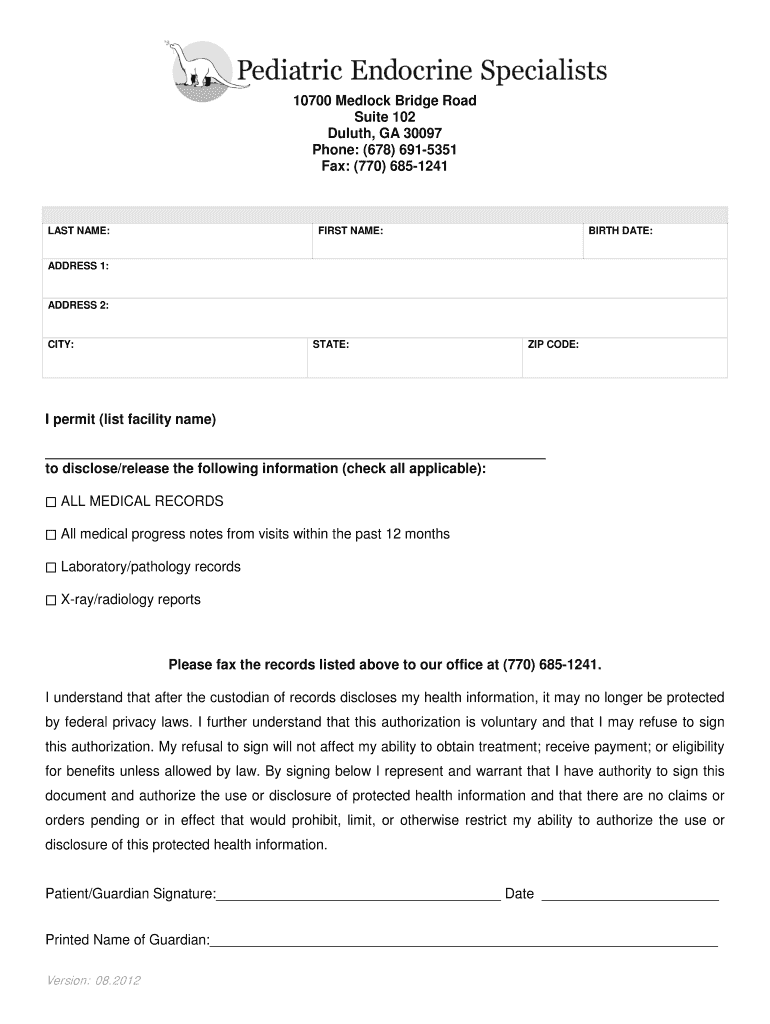 10700 Wedlock Bridge Road Suite 102 Duluth, GA 30097 Phone: (678× 6915351 Fax: (770× 6851241 LAST NAME: FIRST NAME: BIRTH DATE: ADDRESS 1: ADDRESS 2: CITY: STATE: ZIP CODE: I permit (list facility