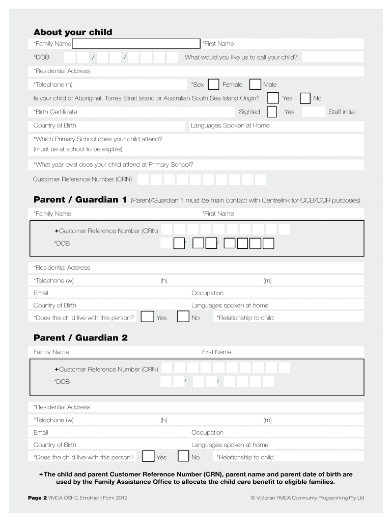 YMCA Outside School Hours Care Vacation Care Enrollment Form 2012 YMCA Completing this Enrollment Form The YMCA is committed to providing quality care for your child. Please complete an Enrollment