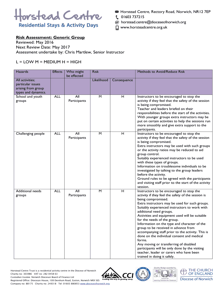 Hosted Center, Rectory Road, Norwich, NR12 7EP 01603 737215 hosted. Center dioceseofnorwich.org www.horsteadcentre.org.uk Risk Assessment: Generic Group Reviewed: May 2016 Next Review Date: May 2017
