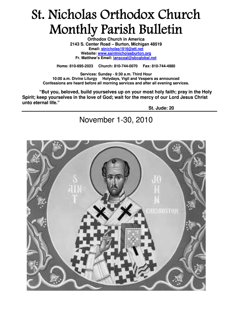 St. Nicholas Orthodox Church Monthly Parish Bulletin Orthodox Church in America 2143 S. Center Road Burton, Michigan 48519 Email: stnicholas1916 ATT.net Website: www.saintnicholasburton.org Fr. Matthew