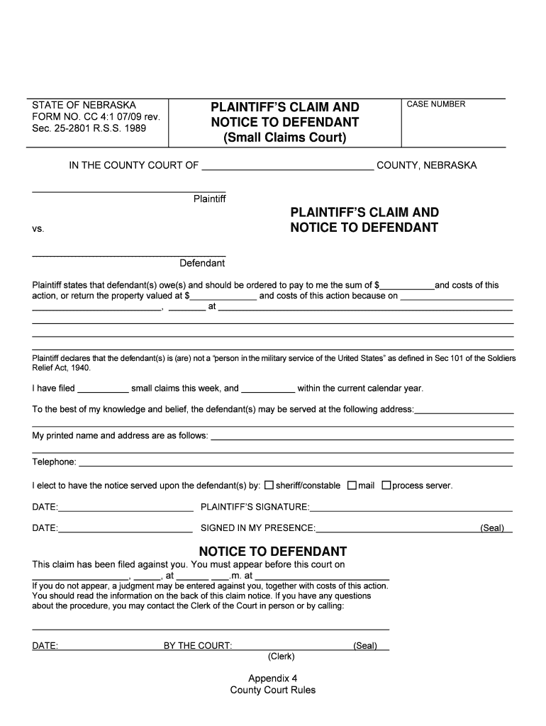 STATE OF NEBRASKA FORM NO. CC 4:1 07×09 rev. Sec. 252801 R.S.S. 1989 CASE NUMBER PLAINTIFFS CLAIM AND NOTICE TO DEFENDANT (Small Claims Court) IN THE COUNTY COURT OF COUNTY, NEBRASKA Plaintiff PLAINTIFFS