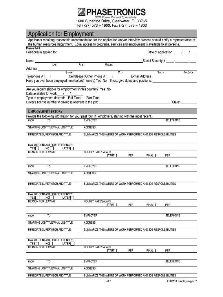 1600 Sunshine Drive, Clearwater, FL 33765 Tel (727× 573 1900, Fax (727× 573 1803 Application for Employment Applicants requiring reasonable accommodation for the application and×or interview process