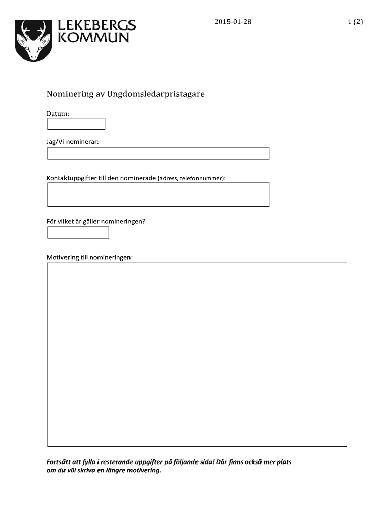 20150128 Nominating av Ungdomsledarpristagare Datum: Jag×Vi mineral: Kontaktuppgifter till den nominee (address, telefonnummer): For ticket r Geller nomineringen? Motive ring till nomineringen: Forest