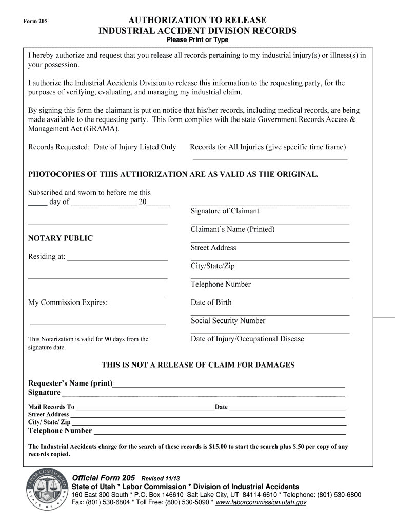 Form 205 AUTHORIZATION TO RELEASE INDUSTRIAL ACCIDENT DIVISION RECORDS Please Print or Type I hereby authorize and request that you release all records pertaining to my industrial injury’s) or illness’s)