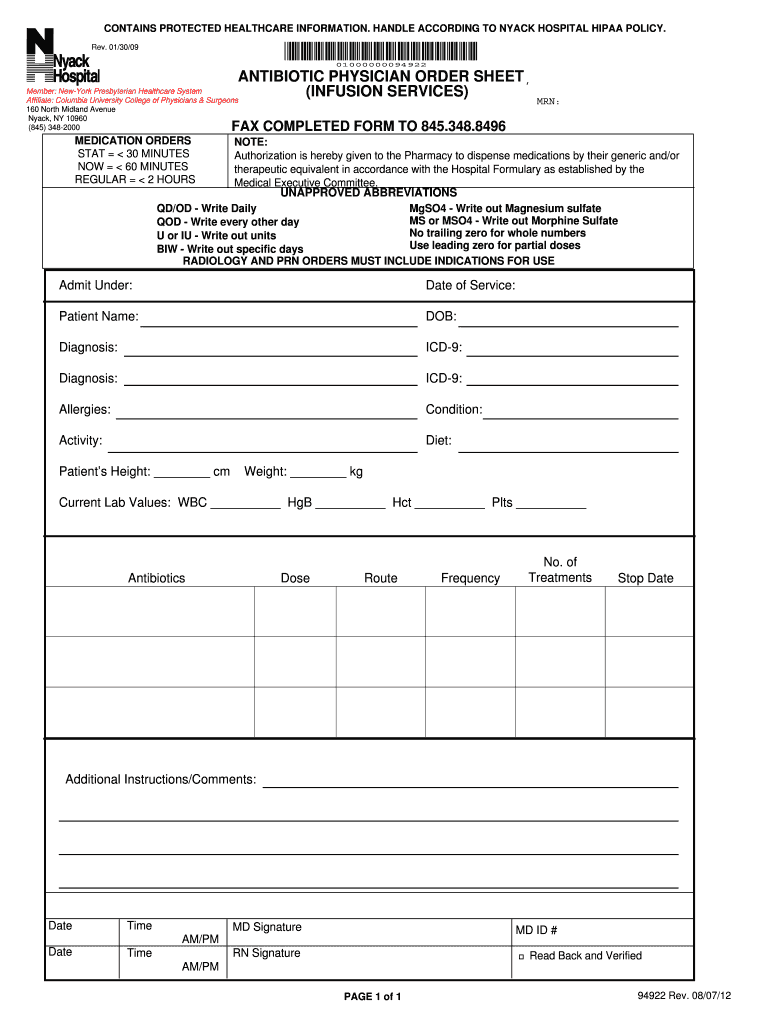 R×01 0 942×r CONTAINS PROTECTED HEALTHCARE INFORMATION. HANDLE ACCORDING TO NY ACK HOSPITAL HIPAA POLICY. Rev. 01×30/09 01000000094922 ANTIBIOTIC PHYSICIAN ORDER Sheets, Member: New York Presbyterian