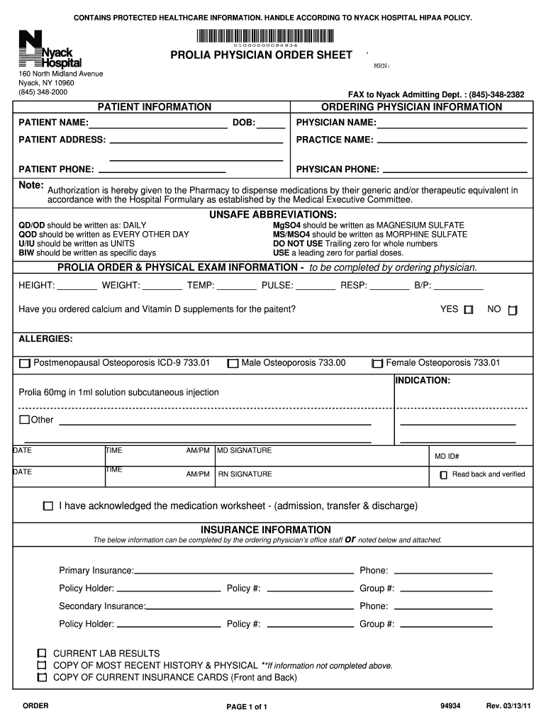R×01 0 943×r CONTAINS PROTECTED HEALTHCARE INFORMATION. HANDLE ACCORDING TO NY ACK HOSPITAL HIPAA POLICY. 01000000094934 PROLIX PHYSICIAN ORDER SHEET 160 North Midland Avenue Back, NY 10960 ×845×