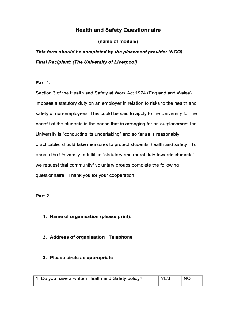 Health and Safety Questionnaire (name of module) This form should be completed by the placement provider (NGO) Final Recipient: (The University of Liverpool) Part 1. Section 3 of the Health and Safety