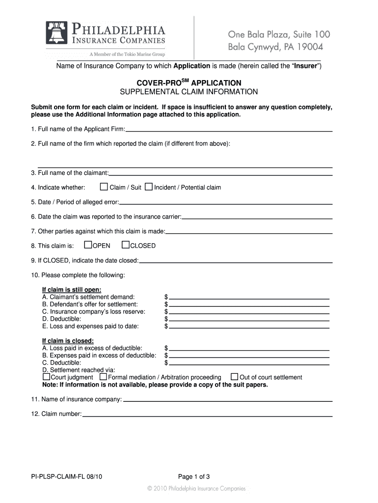 Get the free Supplemental Claim Form - bFLb - Philadelphia Insurance Companies