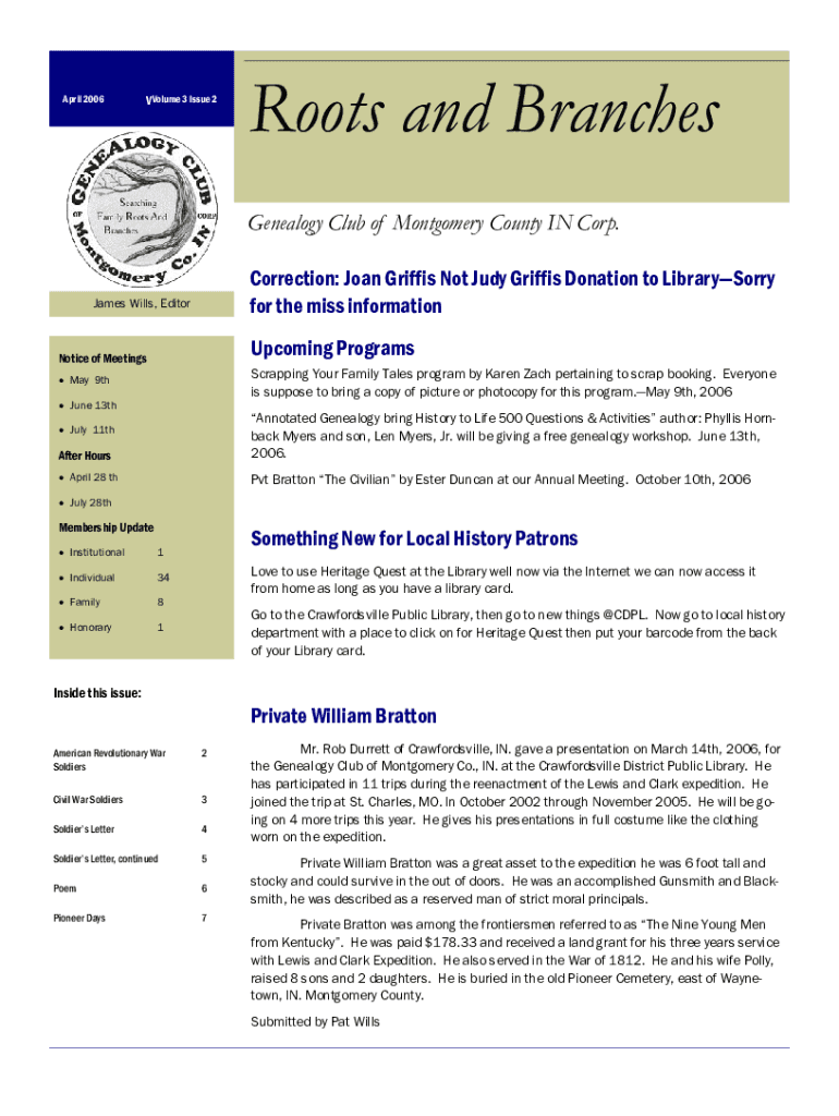 This document contains information about genealogy club activities, scheduled events, historical presentations, membership details, and letters from Civil War soldiers, contributing to the preservation
