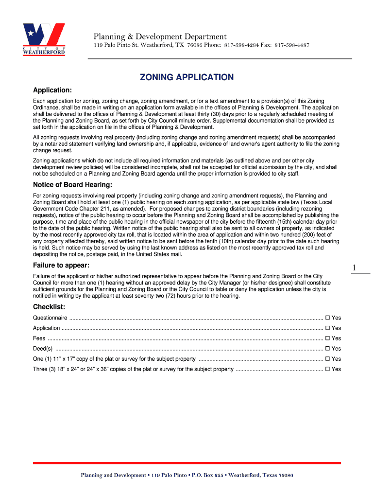 Planning & Development Department 119 Palo Pinto St. Weatherford, TX 76086 Phone: 8175984284 Fax: 8175984487 ZONING APPLICATION: Each application for zoning, zoning change, zoning amendment, or for