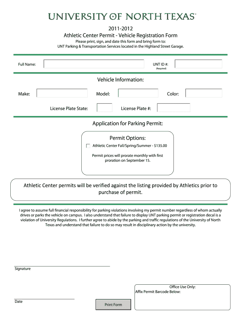 20112012 Athletic Center Permit Vehicle Registration Form Please print, sign, and date this form and bring form to: UNT Parking & Transportation Services located in the Highland Street Garage. UNT