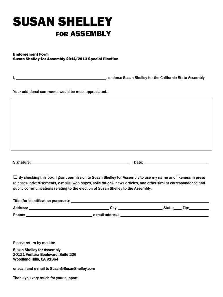 SUSAN SHELLEY FOR ASSEMBLY Endorsement Form Susan Shelley for Assembly 2014×2013 Special Election I, endorse Susan Shelley for the California State Assembly. Your additional comments would be most