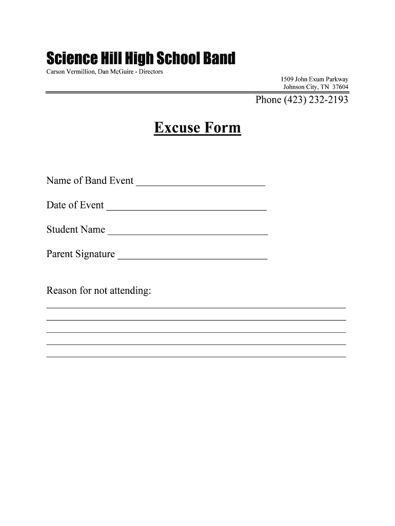 Science Hill High School Band Carson Vermilion, Dan McGuire Directors 1509 John Exam Parkway Johnson City, TN 37604 Phone (423× 2322193 Excuse Form Name of Band Event Date of Event Student Name Parent