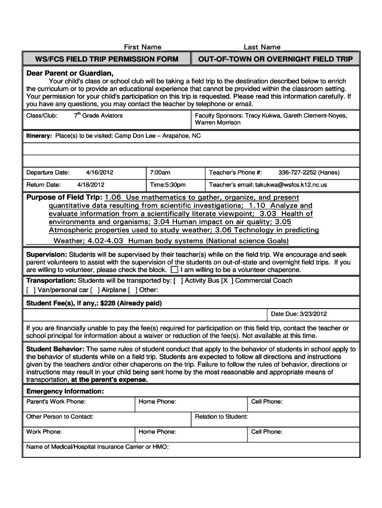 This document is a permission form for parents or guardians to authorize their child's participation in an out-of-town or overnight field trip organized by WS/FCS, detailing the itinerary, supervision,