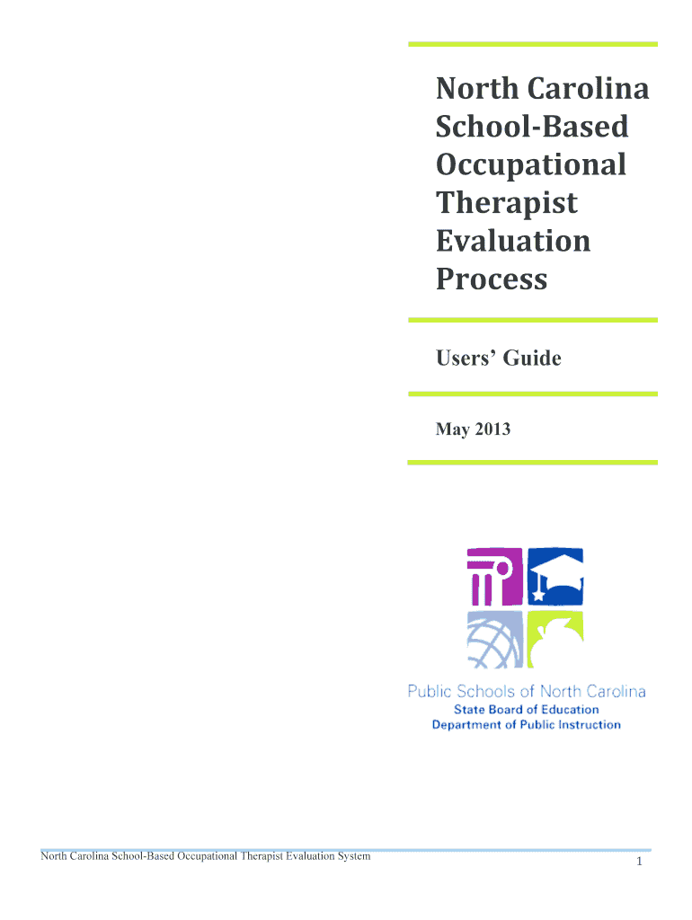 This document provides a comprehensive overview of the North Carolina School-Based Occupational Therapist Evaluation System, including standards, evaluation processes, and resources for occupational