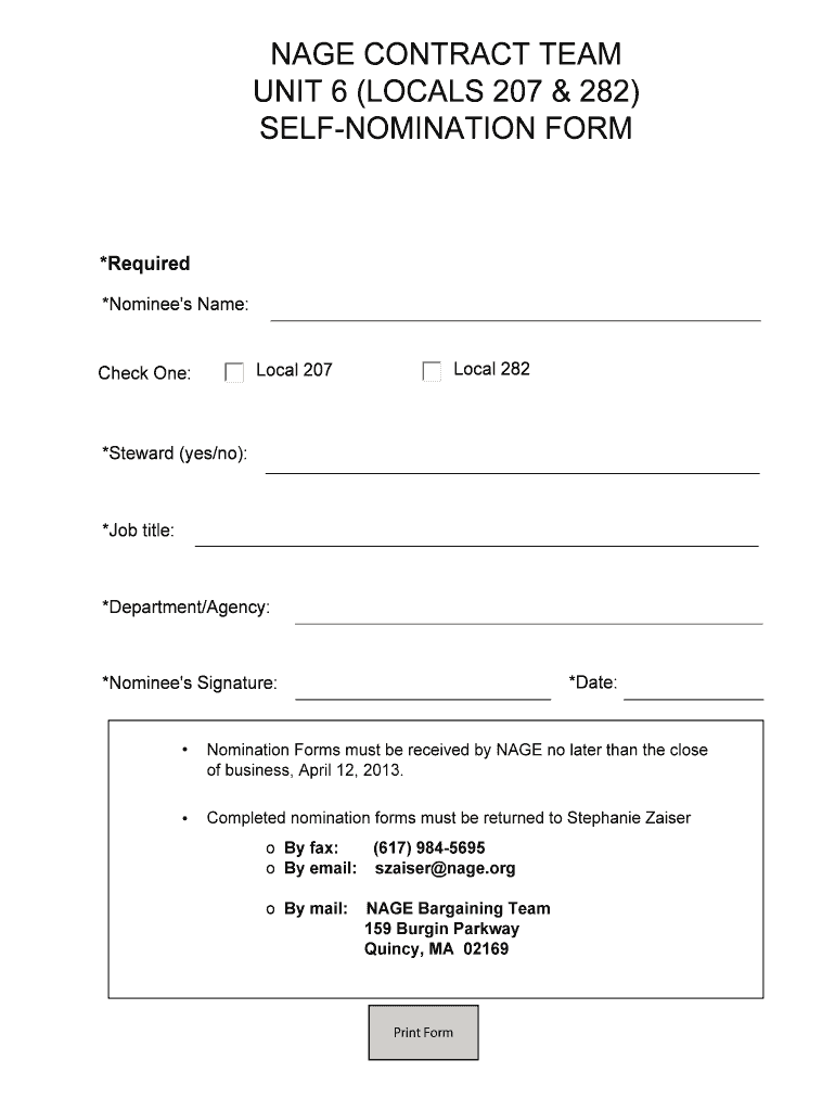 AGE CONTRACT TEAM UNIT 6 (LOCALS 207 & 282) DENOMINATION FORM Nomination Forms must be received by AGE no later than the close of business, April 12, 2013.